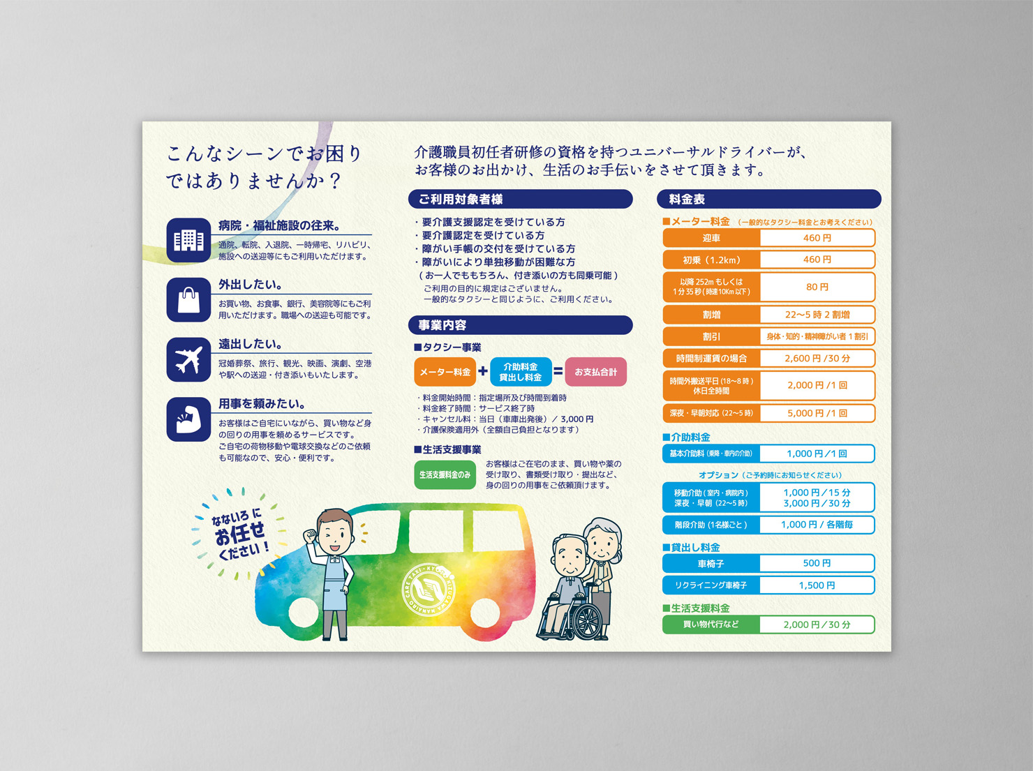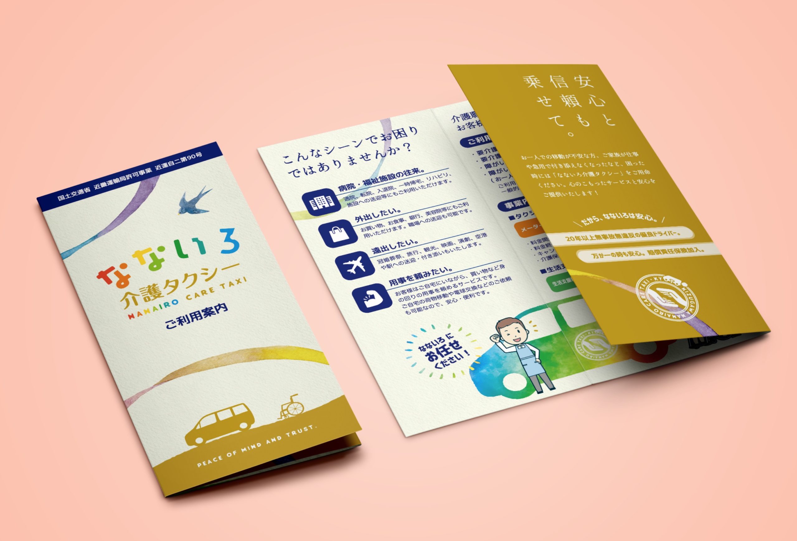 京都府木津川市の介護タクシー事業会社。「安心と信頼も乗せて。」をキャッチコピーに、安心感や信頼感に加え、親しみやすさを加えた事業案内パンフレット。