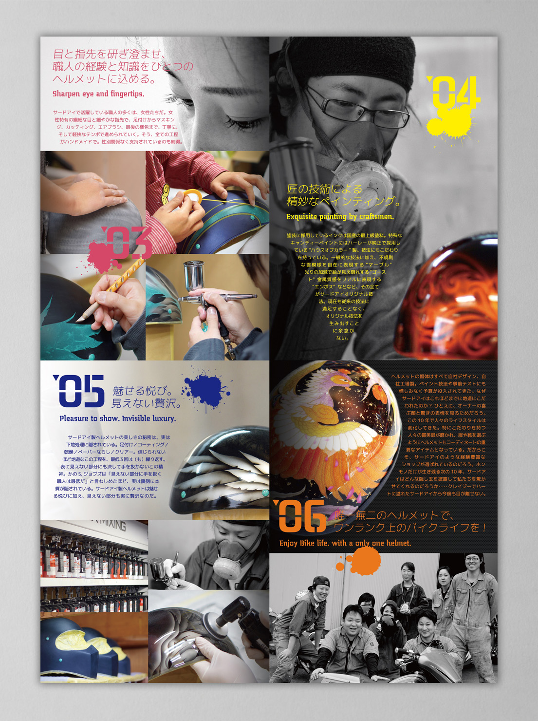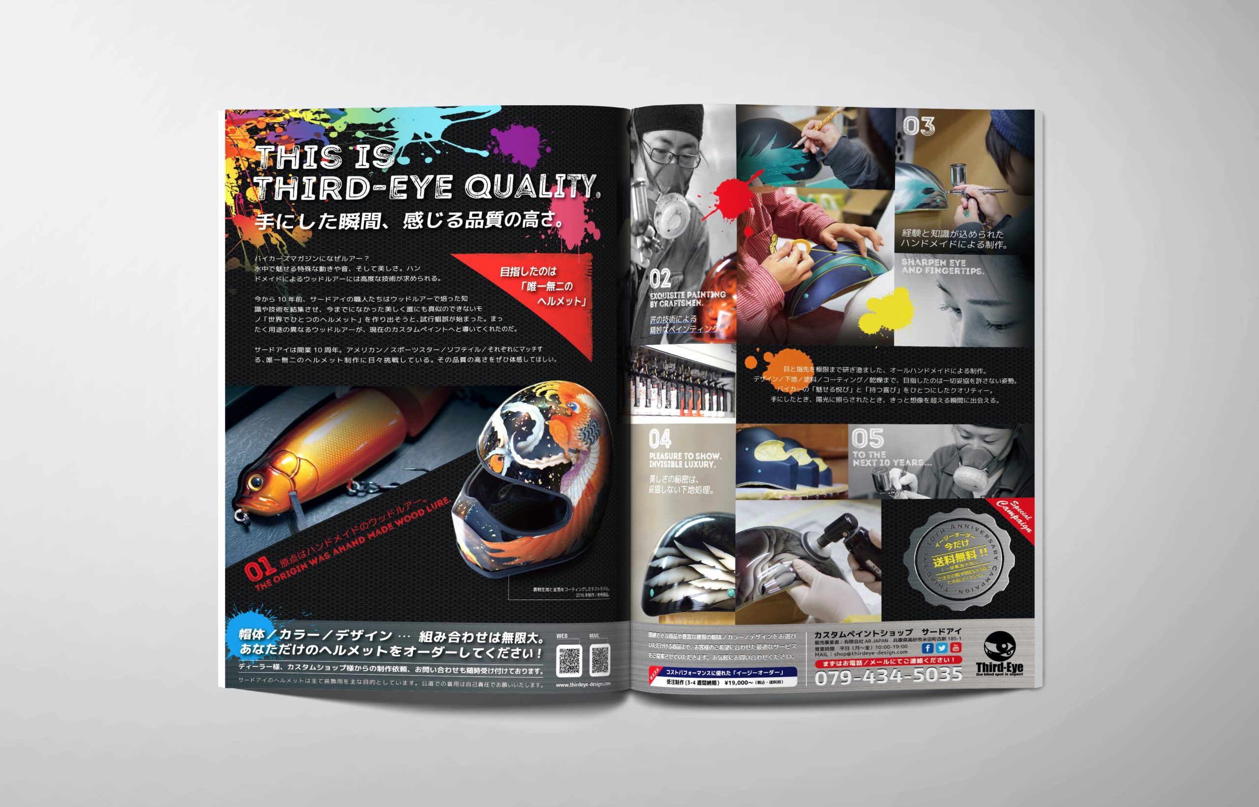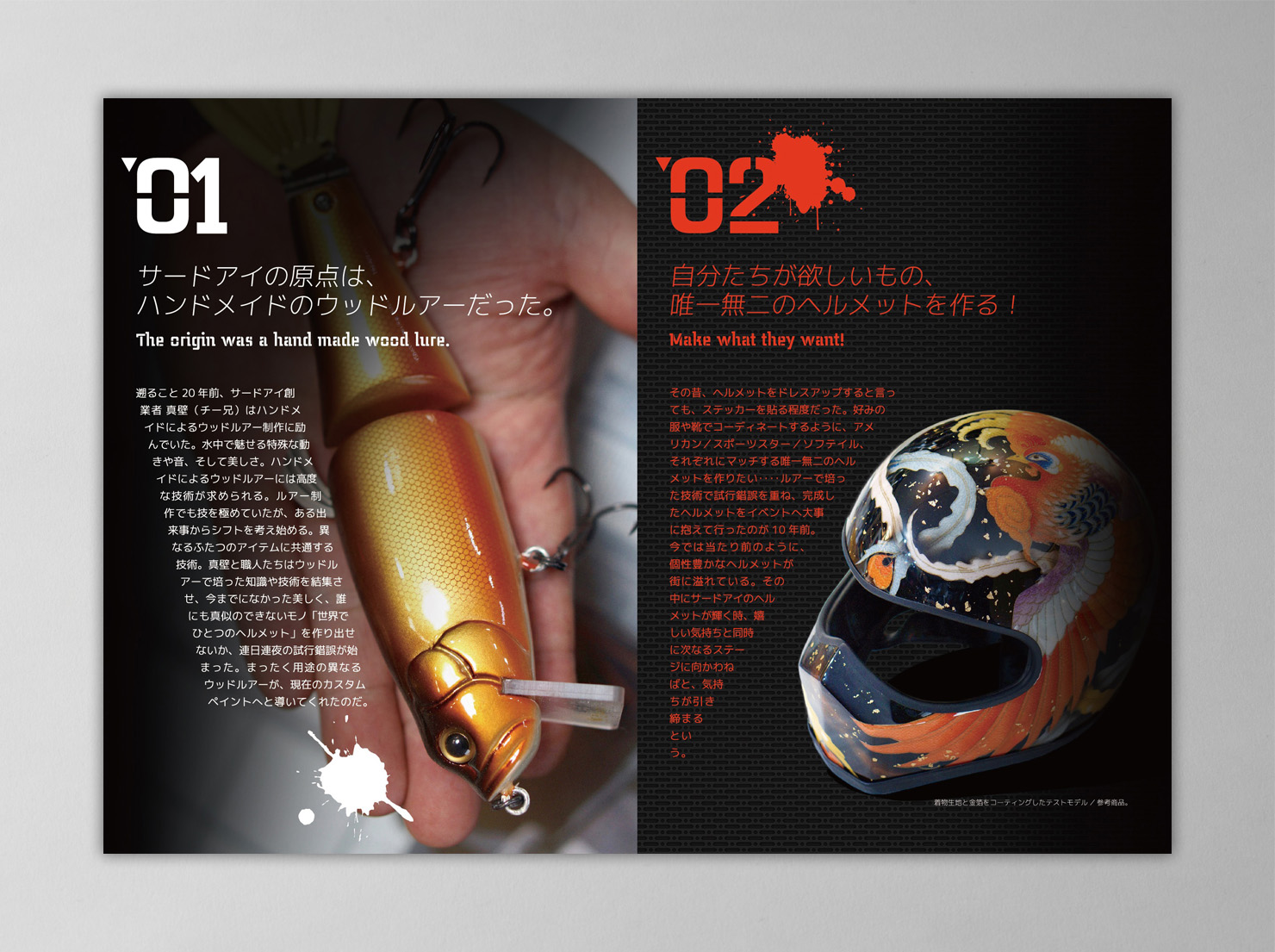 国内屈指の技術と品質を誇るカスタムペイントショップ。開店10周年を機に、改めて原点や制作現場を取材。第三者の目からサードアイのこだわりや品質を紹介し、オーダーヘルメットのパンフレットだけにとどまらないストーリー性のある「1ページ」として提案。(雑誌「VIBES」見開き広告にも展開)